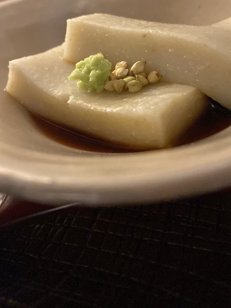 写真は、4月の先付「蕎麦豆富」いちばん初めにお出しするお料理です「富」の字も縁起良く、優しくそして気持ちよくここからお料理が始まるのです
